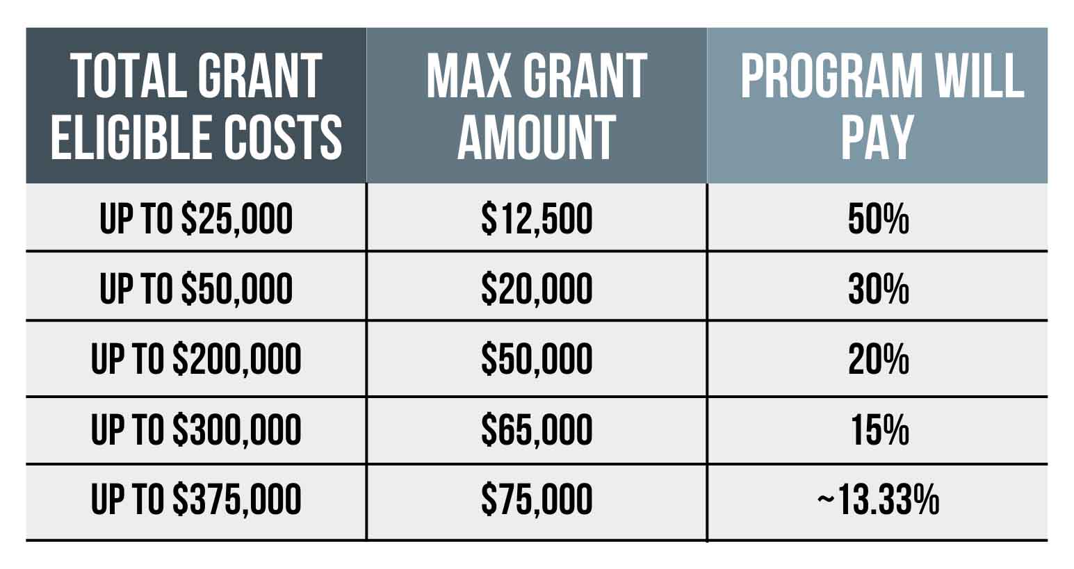 Assume the total grant-eligible project costs are $225,000. The applicant would recieve 50% for the first $25,000 of grant-eligible projects costs, 30% of the additional $25,000 of grant-eligible project costs, 20% of the additional $150,000 of grant-eligible project costs and %15 of the remaining $25,000 of grant-eligible project costs.